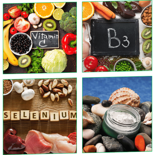 Vitamins: Vitamin B3 (niacin), vitamin C, vitamin E, and biotin.