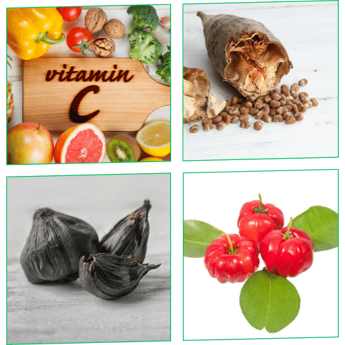 Vitamin C (Ascorbic Acid), Baobab Fruit Pulp (Adansonia Digitata), Capsule: Hydroxypropyl Methylcellulose (HPMC), Stoneground Brown Rice Flour (Gluten Free) (Oryza Sativa), Acerola Extract (Malpighia Glabra), Citrus Bioflavonoids Complex, Zinc Citrate, Natural Rice Extract (Oryza Sativa), Vitamin E as D-alpha tocopheryl succinate, Grapefruit Seed Extract (Citrus Paradisi), Olive Leaf Extract (Olea Europaea), Bioperine (Piper Nigrum), Elderberry Extract (Sambucus Nigra), Cayenne Pepper Extract (Capsicum Annuum), Reishi Mushroom Extract (Ganoderma Lucidum Selenomethionine (Calcium Phosphate), Turmeric Root Extract (Curcuma Longa), Vitamin B6 (Pyridoxine Hydrochloride), Rosehip Extract (Rosa Canina), Vegan Vitamin D3 (Cholecalciferol), Lactobacillus Acidophilus, Ginger Root Extract (Zingiber Officinale), Black Garlic Extract (Allium Sativum).